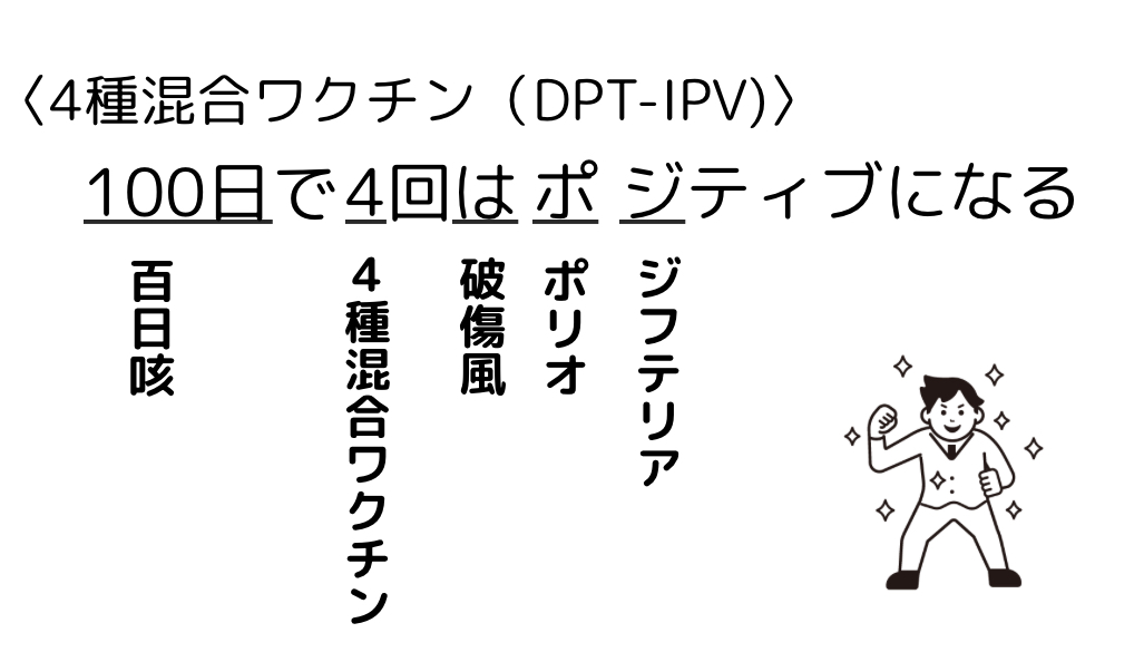 【4種混合ワクチン(DPT-IPV)】薬学ゴロ(衛生) 2026 3/19 薬学ゴロ 2026年3月19日 <ゴロ> 100日で4回はポジティブになる <ゴロ解説> 100日:百日咳4回:4種混合ワクチンは:破傷風ポ:ポリオジ:ジフテリア 薬剤師国家試験対策にお使いください! 薬学ゴロ