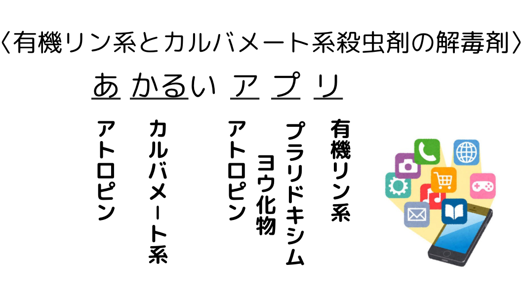 【有機リン系とカルバメート系殺虫剤の解毒剤】薬学ゴロ(衛生) 2026 4/01 薬学ゴロ 2026年4月1日 <ゴロ>あ かるい ア プ リ <ゴロ解説>あ:アトロピンかる:カルバメート系ア:アトロピンプ:ヨウ化プラリドキシムリ:有機リン系 衛生範囲からの薬学ゴロになります! 薬剤師国家試験にお役立てくださいませ! 薬学ゴロ
