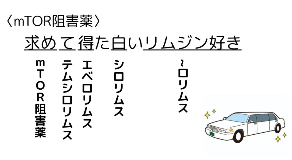 <ゴロ> 求めて 得た 白い リムジン好き <ゴロ解説> 求めて:mTOR阻害薬て:テムシロリムス得た:エベロリムス白い:シロリムスリムジン好き:〜ロリムス 薬理の薬学ゴロになります! 薬剤師国家試験対策にお役立てください! -
