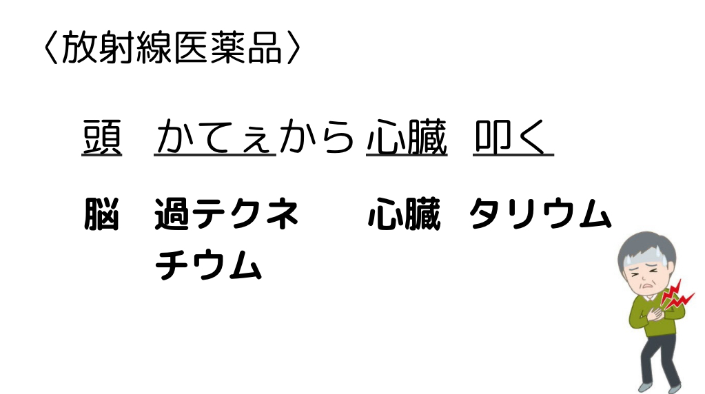 <ゴロ>頭 かてぇから 心臓 叩く <ゴロ解説>頭:脳かてぇ:過テクネチウム心臓:心臓叩く:タリウム 物理の薬学ゴロです! 薬剤師国家試験対策にお役立てください! -