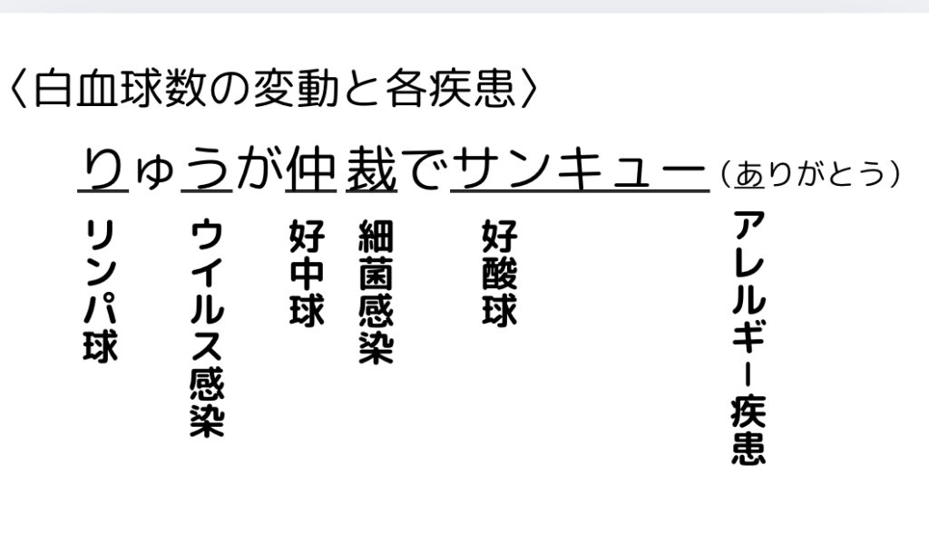 <ゴロ> りゅうが仲裁でサンキュー(ありがとう) <ゴロ解説> り:リンパ球う:ウイルス感染仲:好中球裁:細菌感染サンキュー:好酸球あ:アレルギー疾患 生物の薬学ゴロになります! 薬剤師国家試験対策としてお役立てくださいませ! -