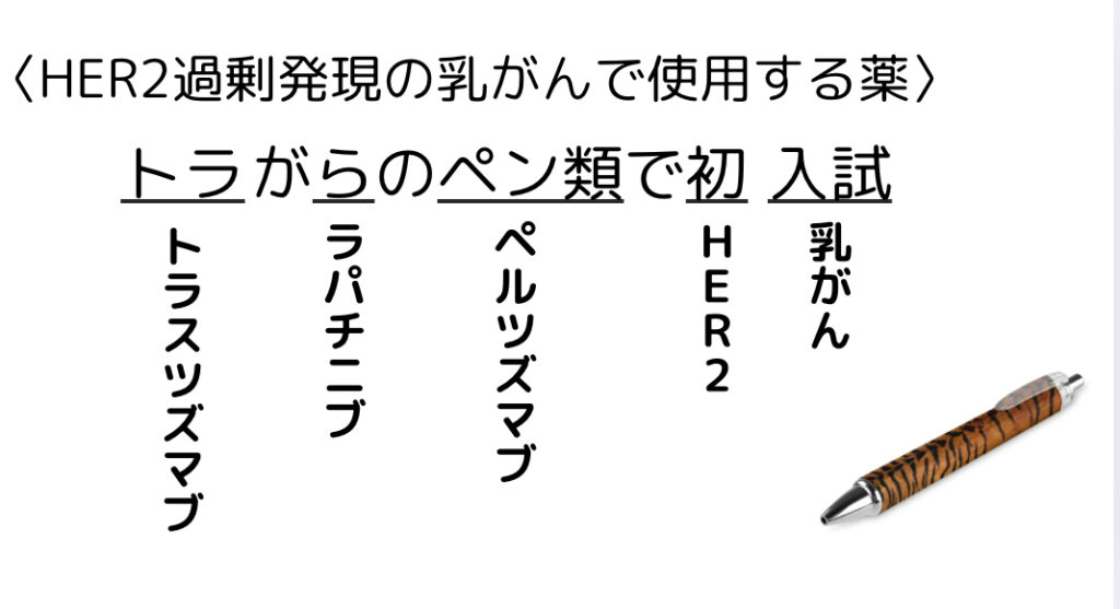 <ゴロ>トラがらのペン類で初入試 <ゴロ解説>トラ:トラスツズマブら:ラパチニブペン類:ペルツズマブ初:HER2入試:乳がん 薬理の薬学ゴロになります! 薬剤師国家試験対策にお役立てくださいませ。 -