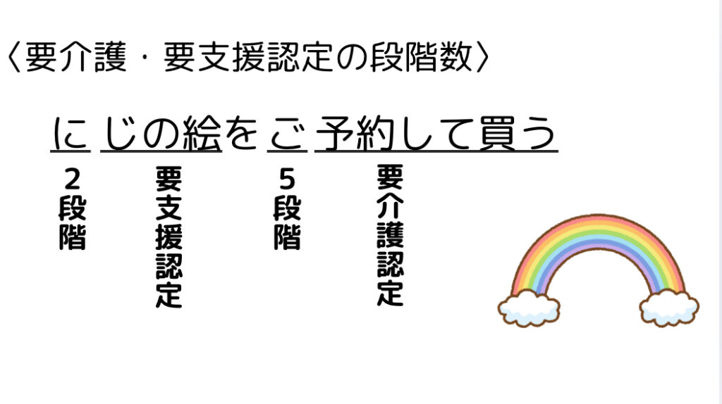<ゴロ> にじの絵をご予約して買う <ゴロ解説> に:2段階 じの絵:要支援認定 ご:5段階 予約して買う:要介護認定 -