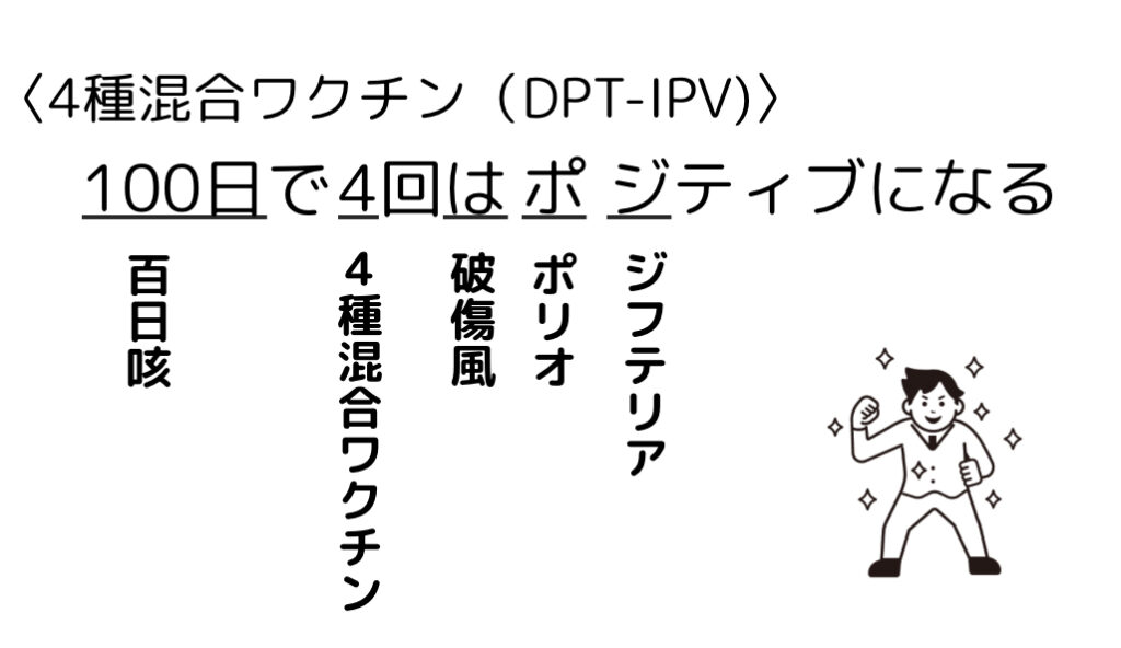 <ゴロ> 100日で4回はポジティブになる <ゴロ解説> 100日:百日咳4回:4種混合ワクチンは:破傷風ポ:ポリオジ:ジフテリア 薬剤師国家試験対策にお使いください! -