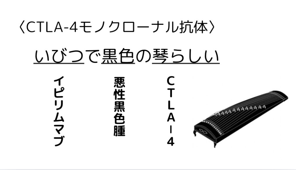 <ゴロ> いびつで黒色の琴らしい <ゴロ解説> いびつ:イピリムマブ黒色:悪性黒色腫琴らしい:CTLA-4 薬剤師国家試験対策にお役立てください! -